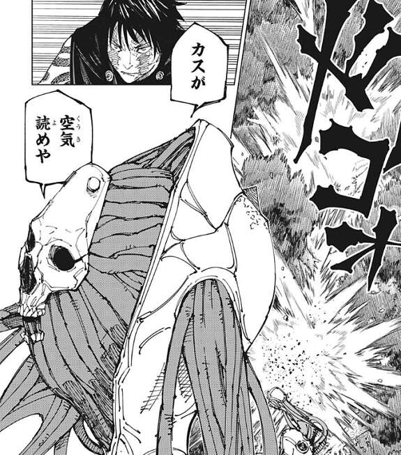 直哉の新たな姿を見た真希は、加茂憲紀の名前を叫びますが、それより早く直哉は加茂憲紀を攻撃します。直哉は一瞬で加茂憲紀の傍まで近づき、パンチで加茂憲紀を吹っ飛ばします。加茂憲紀を吹っ飛ばした直哉は、カスが、空気読めや、と悪態をつきます。