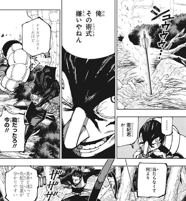 矢を放ったのは加茂憲紀で、直哉は加茂憲紀が攻撃したと分かり、俺その術式嫌いやねん、とつぶやきます。一方、加茂憲紀の攻撃は勘だったようで、真希は加茂憲紀に対して、勘だったろ!!今の!!と、抗議しますが、加茂憲紀はあまり気にせずさらに矢で直哉を攻撃します。
