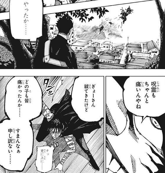 刀で切り裂かれた直哉は、呪霊もちゃんと痛いんやね、と言うと今まで祓ってきた呪霊に申し訳ないと言います。