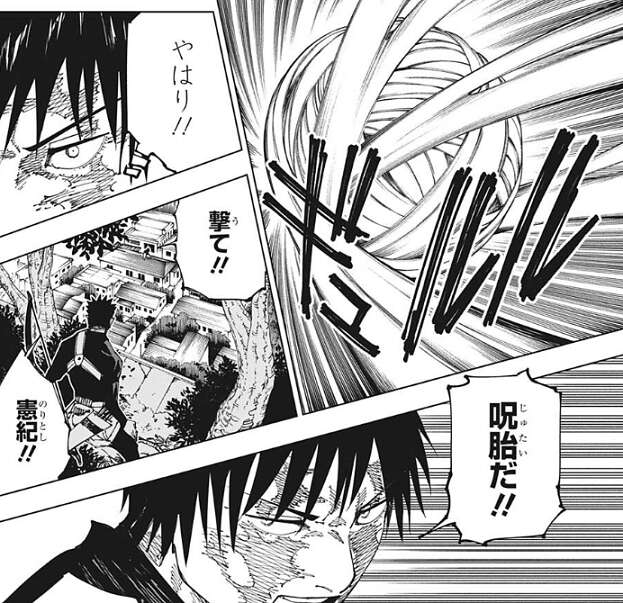 直哉の体が繭になっていく様子を見て驚く真希と加茂憲紀ですが、真希は直哉が変態を遂げようとしている分かると、加茂憲紀に撃て!!と、叫びます。