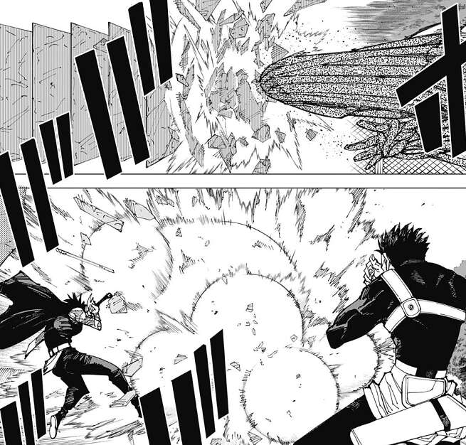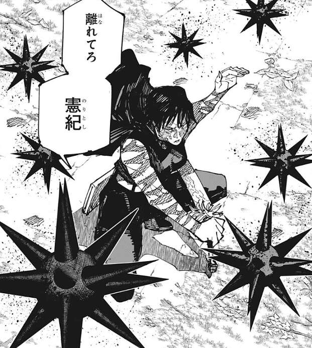 さらに真希は加茂憲紀に、コイツは使うぞ 術式、と言い直哉は呪霊でも術式「投射呪法」を使うと、警告します。すると、直哉は投射呪法の触れたものを1秒間固定する能力を応用し、空気を固定しそれを拳で捉えて爆ぜさせる、という技を真希に対して使います。