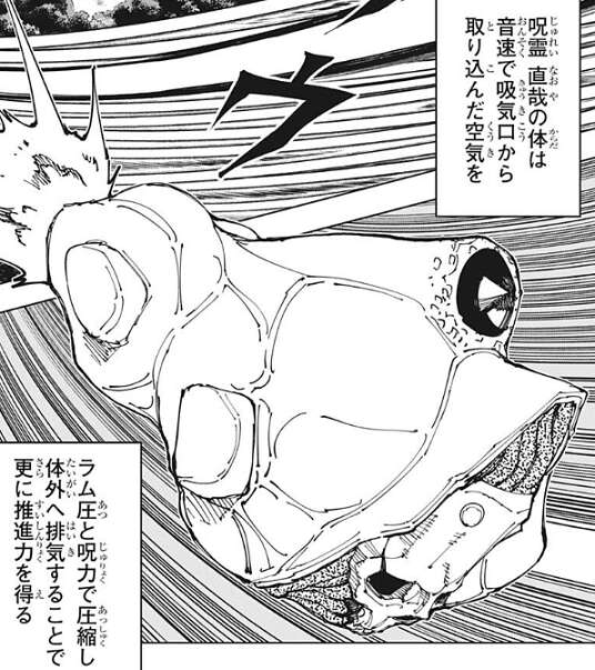 呪霊 直哉の体は音速で吸気口から取り込んだ空気を、ラム圧と呪力で圧縮し体外へ廃棄することで更に推進力を得て、スピードを上げていました。