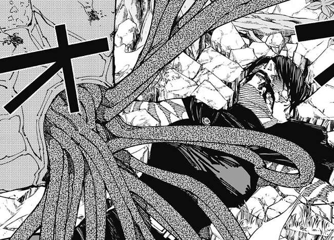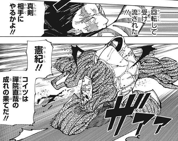 真希は「赤縛」で動けない直哉を呪具の刀で斬ろうとしますが、直哉は体を回転させて呪具の刀を受け流し、さらに加茂憲紀の「赤縛」から逃れます。攻撃をかわされた真希は加茂憲紀に、この呪霊が禪院直哉の成れの果てだと教えます。