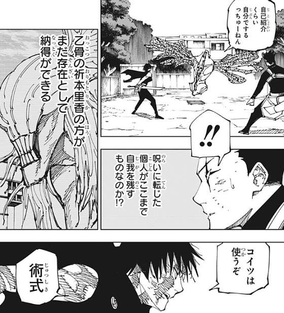 加茂憲紀は呪霊が直哉から転じた呪いだと知り、呪いに転じた個人がここまで自我を残すものなのか!?と、驚愕し、乙骨の折本里香の方がまだ存在として納得できる、と考えてしまいます。