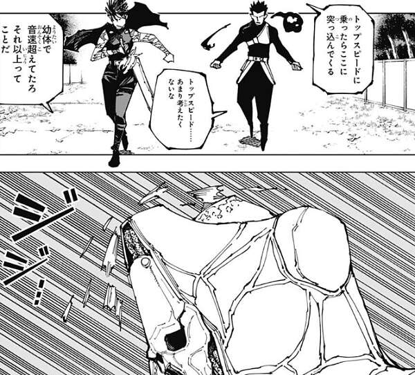加茂憲紀は、直哉のトップスピードはあまり考えたくないと言い、真希も、幼体で音速超えてたろ、それ以上ってことだ、と直哉の速度を警戒します。真希と加茂憲紀はカウンターを狙う事にし、直哉が真希のところに音速で突っ込んでくるなら、コッチは攻撃置いて待ってりゃいい、と言い、以前直哉を殴ったと同じ様な形で攻撃しようとします。