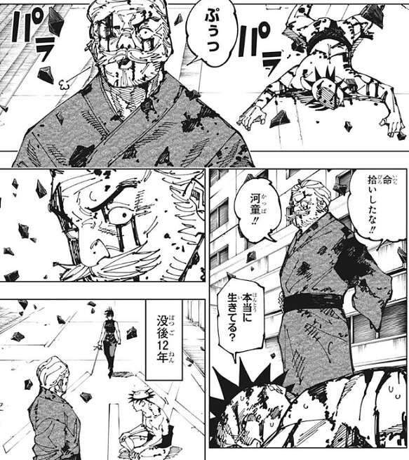 三代は倒れてしまい、大道も身動きが出来なくなってしまいます。直哉は2人が血まみれになっている様子を見て、うん ええ領域やわ、気分ええわ、とつぶやき、真希の気配を探ります。しかし、真希の気配を感じることが出来ません。直哉は、いくら甚爾と同じように呪力が無くなったからといって、自分の領域展開の中で居場所が分からない事があるのか?と、疑問に思います。その時、大道が刀を強引に振ろうとしますが、領域の効果で腕まで吹っ飛んでしまい刀が直哉の方に飛んでいきます。