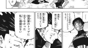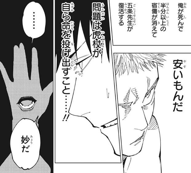 虎杖は、死滅回游でルールを追加する為の点は既に貯まり、自分が死んで半分以上の宿儺が消えて、五条が復活するなら自分が死ぬのは安いもんだ、と思い、いつでも死んでやると心の中で決意します。一方、伏黒は虎杖が自ら命を投げ出す問題がある事を、既に分かっていました。