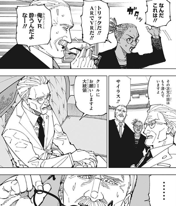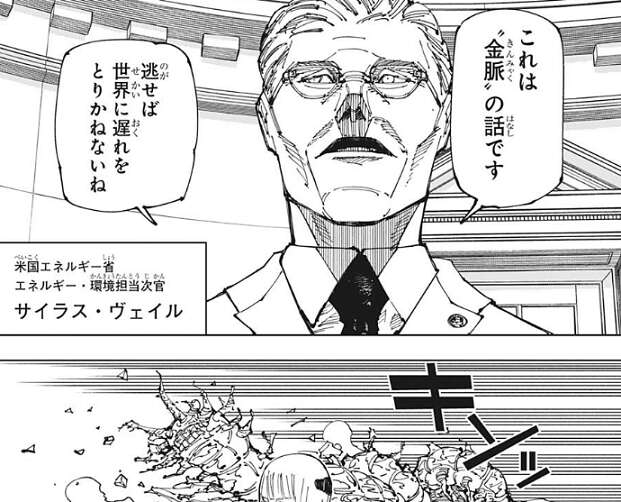 しかし、アメリカ大統領や他数名の人物はトリックだ、ARでVRだ、と騒いで呪霊を信じようとしません。そんな中、米国エネルギー省、エネルギー・環境担当次官のサイラス・ヴェイルという人物だけは、羂索や裏梅が言っている事を信じます。