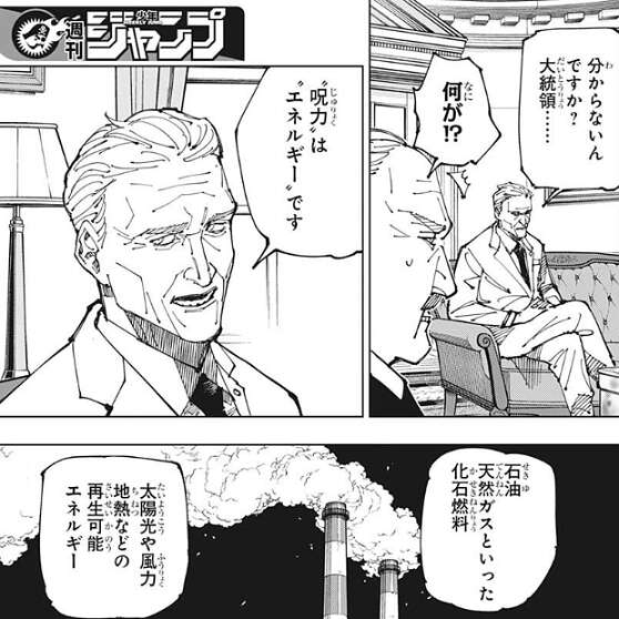さらに羂索は呪霊を消し去ると、メカ丸が遺した映像をアメリカ大統領たちに見せます。呪霊や呪術師達の戦いの様子がどんなものかを映像で見せますが、アメリカ大統領たちはまるで映画だと言って信じようとしませんが、サイラスは映像を信じて“呪力”は“エネルギー”だとアメリカ大統領に伝えます。そして化石燃料や再生可能エネルギー、全てにとって代わる人類史上最もクリーンなエネルギーが“呪力”だ、とサイラスはアメリカ大統領に力説します。