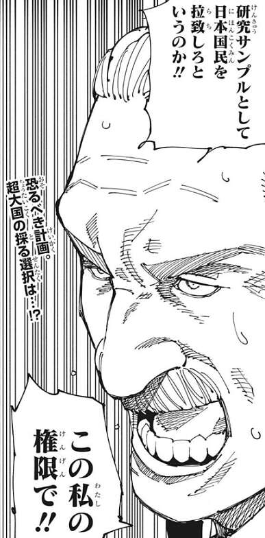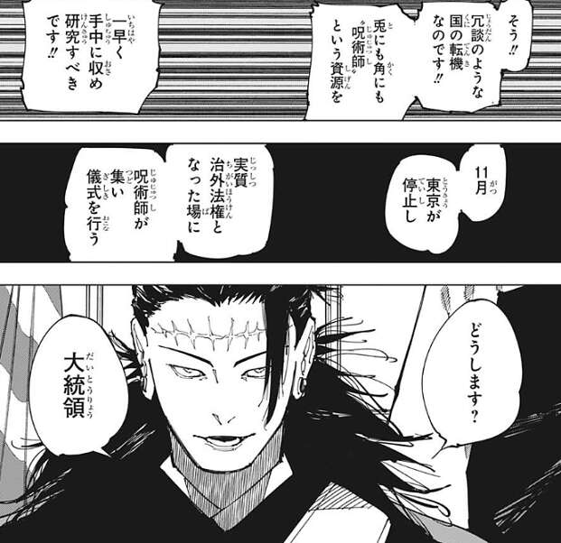 アメリカ大統領は、研究サンプルとして日本国民(呪術師)を拉致するように羂索が言っていると理解し、羂索の示した計画に驚愕します。