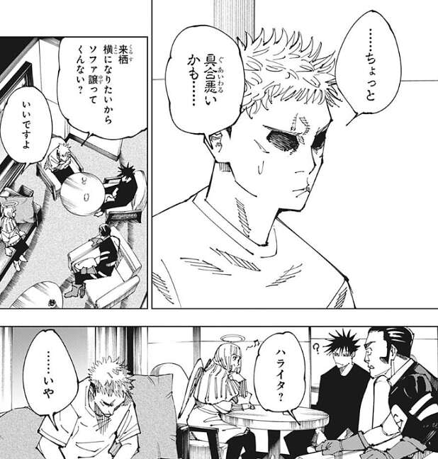 虎杖は来栖にソファを譲ってもらい、来栖から見えない位置へと移動した虎杖は突然、腕を広げて何かを伏黒に伝えようとします。