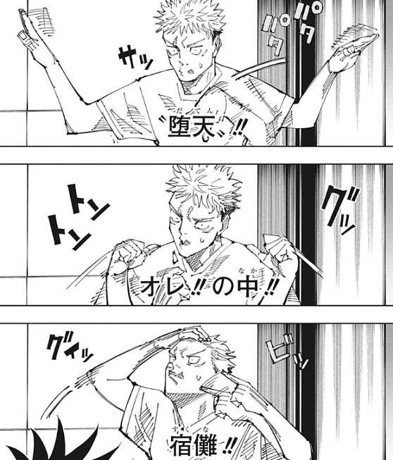 宿儺に“堕天”は俺だ、と教えられた虎杖は驚き、表情の変化は伏黒にも知られてしまいます。伏黒にどうしたと聞かれて、困った虎杖は具合が悪いと嘘をつきます。