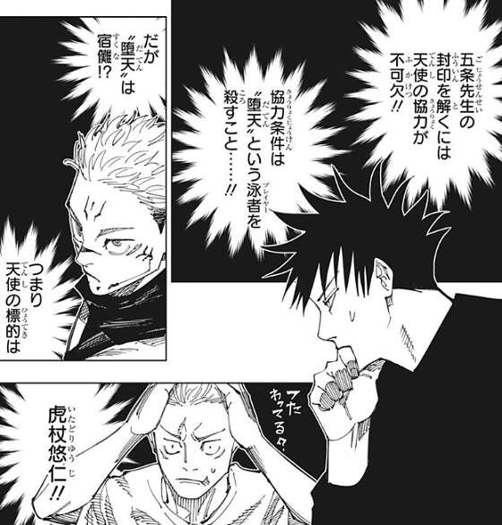 そして、伏黒は“堕天”が宿儺、つまり天使の標的が虎杖だという事を理解します。一方、伏黒にジェスチャーで伝わったと分かった虎杖は、どうして宿儺がわざわざ自分に口止めしたか、理由を考えます。そして、きっと天使に復活の余地なく完全に宿儺を殺すだけの能力があるからだ、と虎杖は推測します。