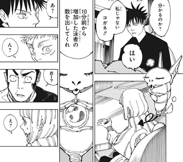 その時天使が、妙だ、と言い、凄い数の人間が結界(コロニー)に侵入している事を伏黒達に伝えます。そしてコガネを呼び出し、10分前から増加したプレイヤーの数を出すように天使は頼みます。すると、表示された数は806、807…、とどんどん増えていきます。800人以上のプレイヤーが結界(コロニー)に侵入している事に、4人は驚愕します。