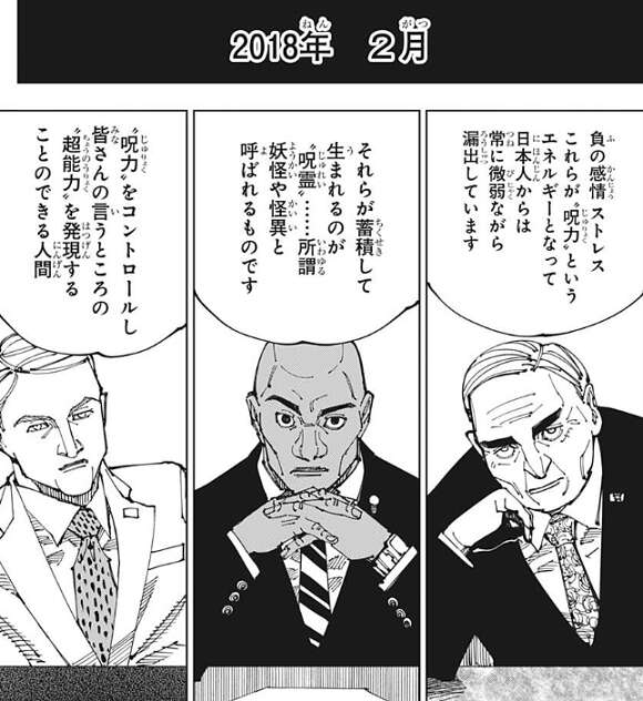 ここで場面はかなり遡って2018年2月、「渋谷事変」や「死滅回游」よりかなり以前まで戻ります。アメリカでは羂索と裏梅が呪力や呪霊について、アメリカ大統領や官僚と思われる数名に説明をしています。