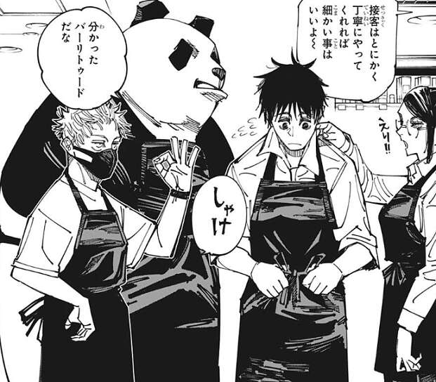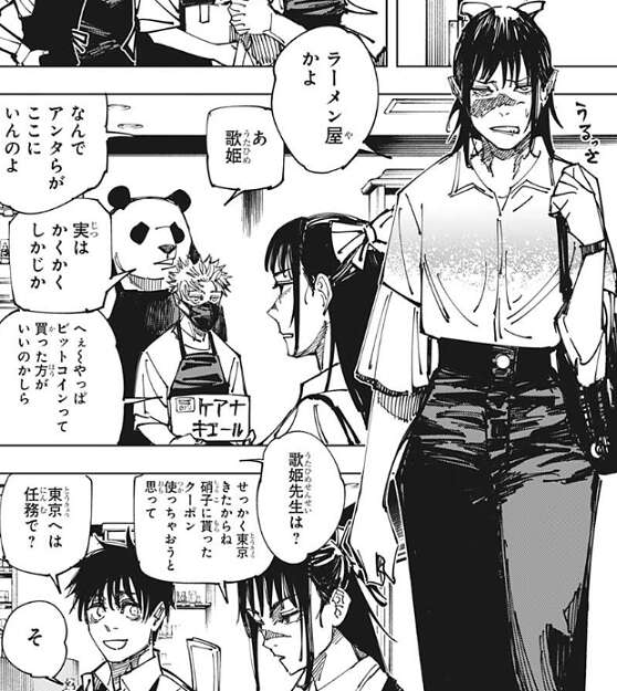 さらに庵歌姫は、年齢はデコルテに出る…!!と、乙骨達に教えますが、乙骨や真希はデコルテを知らず、デコルテをラピュタに出てくるゴリアテと勘違いしてしまい、庵歌姫から、それはゴリアテだろーが!!!と、ツッコまれます。ここでパンダが、そんなことより「鱧の湯引き」の話をしよう、最近みんなで料理に凝っているんだよ、とグルメブールが起こっている事を庵歌姫に説明します。