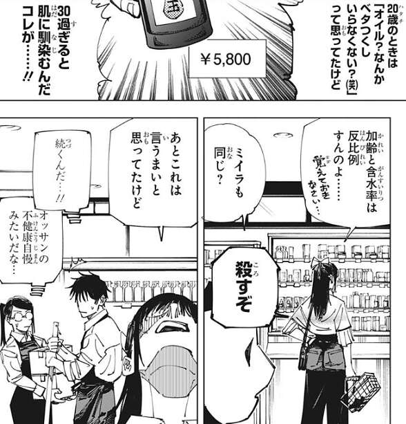 呪術高専でグルメブールが起こり、乙骨達も料理にはまりますが、材料費、遠征費、器具代などで貯金が底をつき、日払いのバイトを始めます。そこに、庵歌姫が客としてやってきますが、料理の話そっちのけで美容の話ばかりとなってしまいます。庵歌姫もスキンケアには苦労しているようで、美容オイルについて等、熱く語っています。