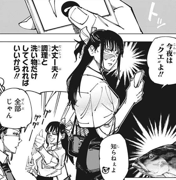 乙骨達が最近料理に凝っているという説明を聞き、庵歌姫は家入硝子に電話をします。ふるさと納税の時、“クエ”をノリで頼んでいたようですが、乙骨達が捌けると分かり、調理と洗い物を頼もうと庵歌姫は考えます。