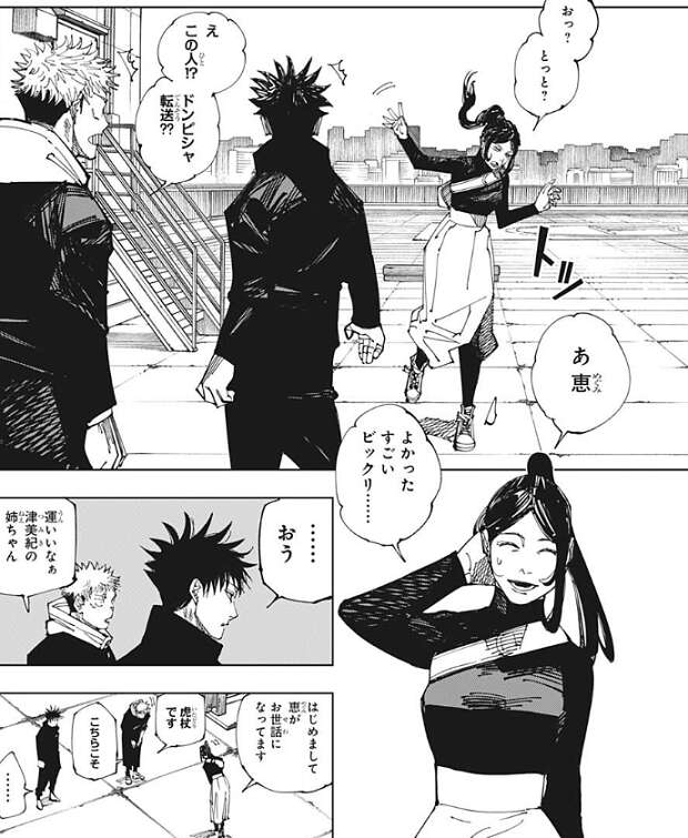 そして、津美紀は結界(コロニー)内に転送され、ちょうど伏黒と虎杖の前にドンピシャで転送されてます。津美紀と虎杖が律義に挨拶を交わしています。