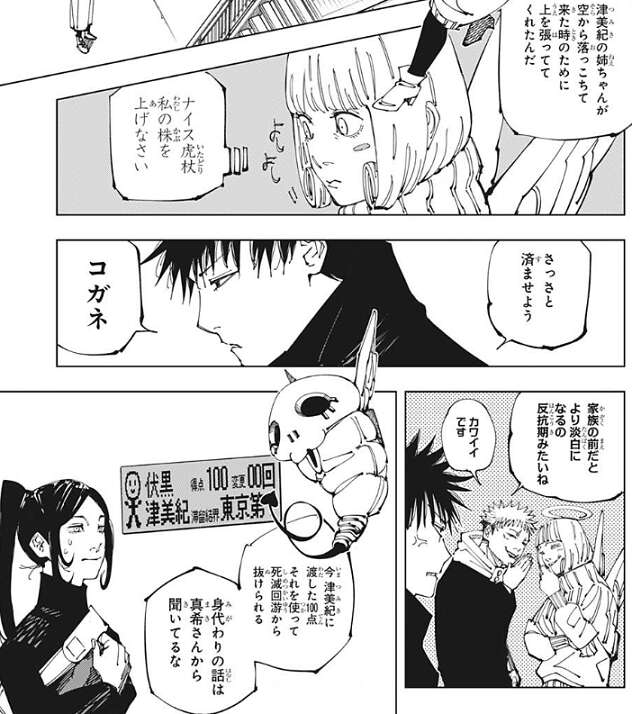 来栖は津美紀が空に転送されて落ちてしまった場合を考えて、上空で待機していました。虎杖がその事を津美紀に説明すると、来栖は自分の株が上がった、と心の中でナイス虎杖と喜びます。早速、津美紀に100点のポイントを渡し津美紀の代わりに伊地知を身代わりにして、津美紀を死滅回游から離脱させようとします。伏黒が津美紀の前だとより淡泊な感じで進めようとする様子を見て、虎杖と来栖がひそひそと伏黒にツッコんでいます。