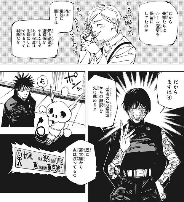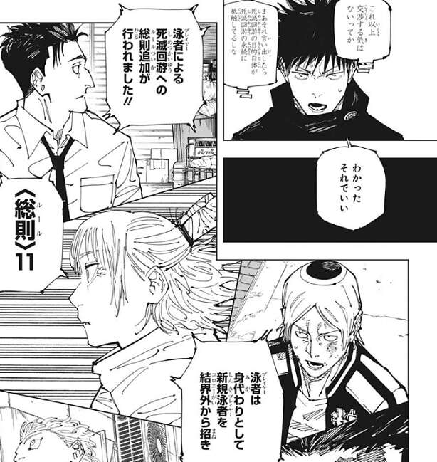 しかし、伏黒の抗議にはコガネは何も答えず、結局コガネが提案したルールが死滅回游のルール11として追加されます。