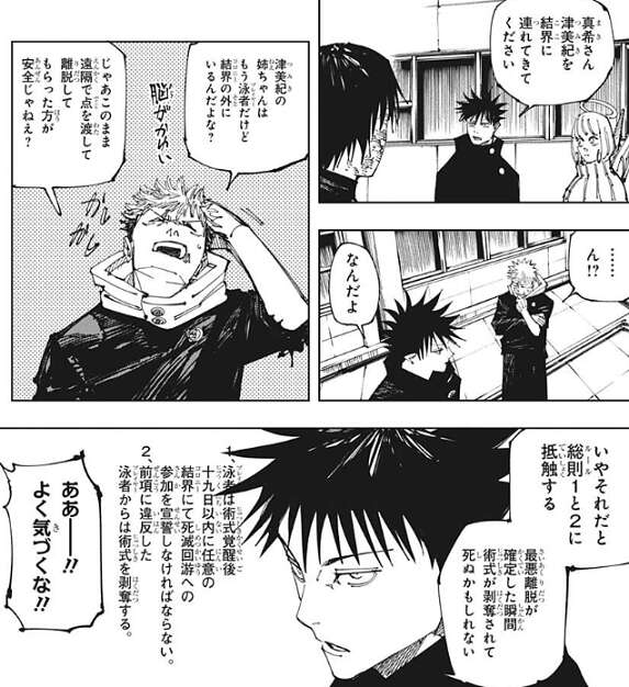 伏黒は真希に、津美紀を結界(コロニー)内に連れてくるように頼みますが、虎杖は結界(コロニー)の外にいるのなら、このまま遠隔でポイントを渡して離脱してもらった方が安全じゃねぇ?と、伏黒に言います。しかしそれだとルール1の、プレイヤーは術式覚醒後一九日以内に任意の結界(コロニー)にて死滅回游への参加を宣誓しなければならない、に抵触する事を伏黒は指摘します。この場合、最悪離脱が確定した瞬間に、ルール2の、前項に違反したプレイヤーからは術式を剥奪する、が実行されて術式が剥奪され、津美紀は死ぬ可能性があります。さらにポイントを下手に長い間所持していると、他のプレイヤーに狙われるリスクが高まるので、津美紀と合流することが一番安全だと伏黒は言います。