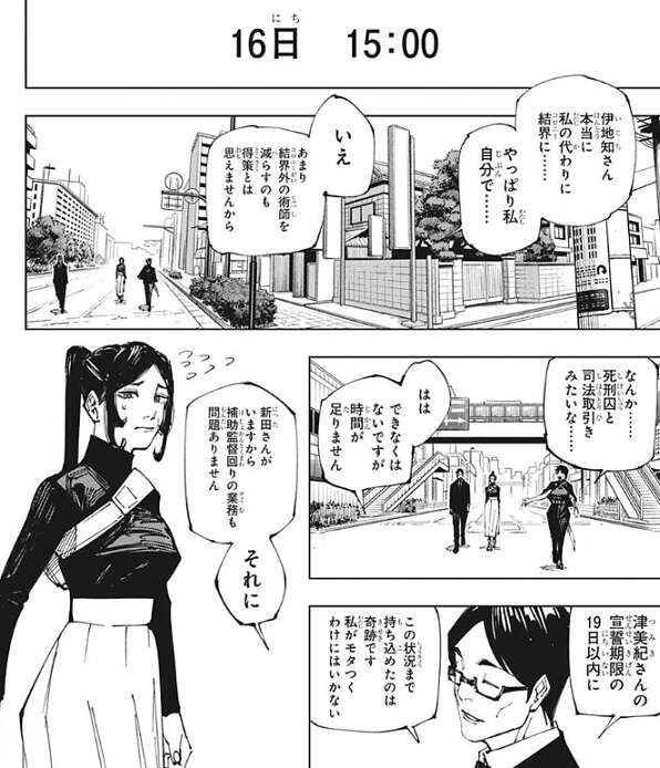 そして時間は16日の15時に進み、真希が津美紀と伊地知を連れて、結界(コロニー)へと向かっています。伊地知が津美紀の身代わりとして選ばれたようですが、津美紀は伊地知が自分の代わりに結界(コロニー)に入る事を気にして、やっぱり自分で……、と言おうとします。しかし、結界(コロニー)外の術師を減らすのは得策でない、と伊地知は気にしないように津美紀に言います。他の身代わりの人間を探すことも考えますが、津美紀の宣言期間19日以内まで時間が足りないという事で、伊地知は自分でいいと言います。さらに伊地知は学生時代、術師志望だったことを明かし、五条に術師をやめるように言われてやめたことも明かします。伊地知は五条がなんてデリカシーのない人……、と思ったようですが、同時に救われたとも思ったようで、五条がああ言ってくれなかったら、今頃は中途半端な術師になってすぐ死んでいただろう、と伊地知は言います。