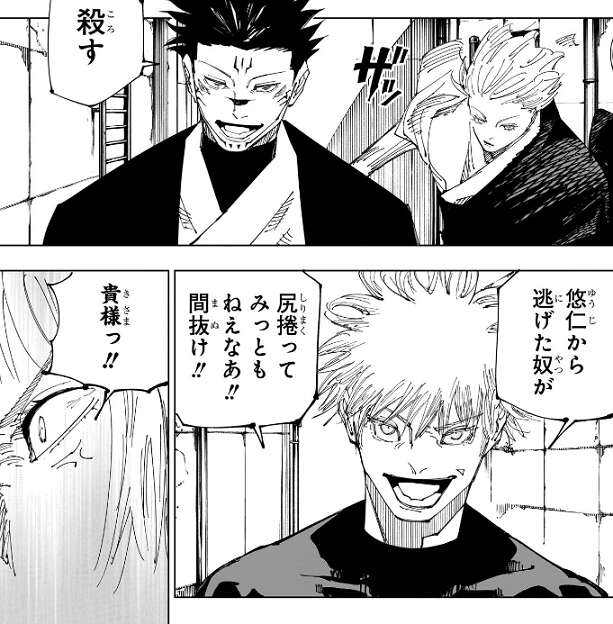 宿儺は、小僧の体モノにしたら真っ先に殺してやる、という1巻3話で言っていたセリフを思い出しながら、殺す、と五条に言います。しかし、悠仁から逃げたヤツが尻捲ってみっともねえなあ!!間抜け!!と、五条は宿儺に煽りを入れて、その煽りに裏梅が激怒します。