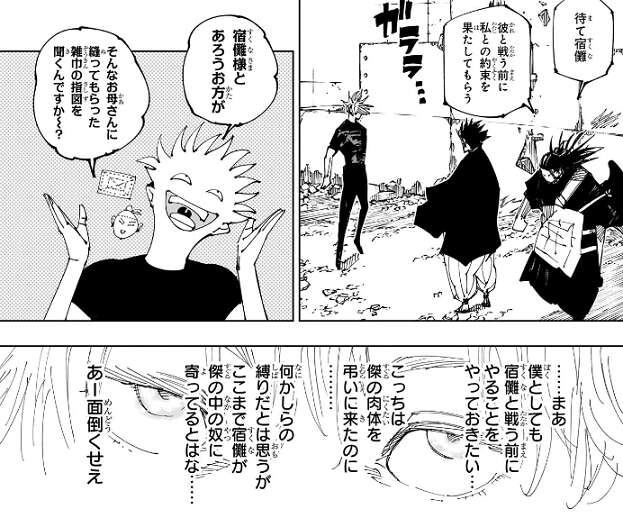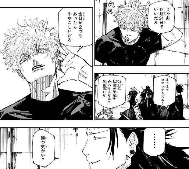 五条は今が11月19日だと教えてもらうと、決戦の日付は12月24日でいいだろ、と宿儺と羂索に言います。羂索は、イブに私達が予定を会わせるなんて気色悪いな、と言いますが、五条は命日が2つもあったらややこしだろ、と言い返します。羂索は、勝つ気かい?と、五条に問うと、五条は1巻3話で虎杖と会話した内容を思い出します。