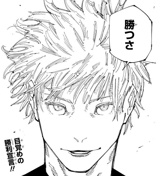 虎杖との会話を思い出した後に五条は、勝つさ、と宿儺と羂索に断言します。