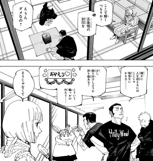 獄門疆の中では物理的時間は流れていないので、ハロウィンからの19日間を五条がどう感じたかを天使は危惧します。もしかしたら、一瞬のように感じているかもしれないし、逆に100年以上待ちぼうけをくらっている状態かもしれない、と天使は言います。天使は五条の精神状態を懸念していて、五条がもし錯乱しているようなことがあれば、こんな狭い空間で封印を解くのは非常に危険……、と家入が天使の考えを代弁します。虎杖や秤も、それは確かにデンジャラスだな、という事で封印を解く場所を移動することにします。