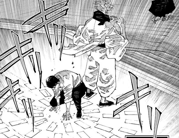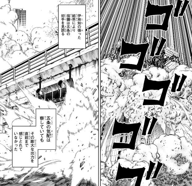 虚式「茈」によって、宿儺がいた高層ビルは崩壊します。伊地知の張った結界により宿儺は五条の初手を見誤ったようです。五条の気配は察していても、歌姫の術式で呪力総量、出力を増幅させていたことまでは気付かなかったようです。