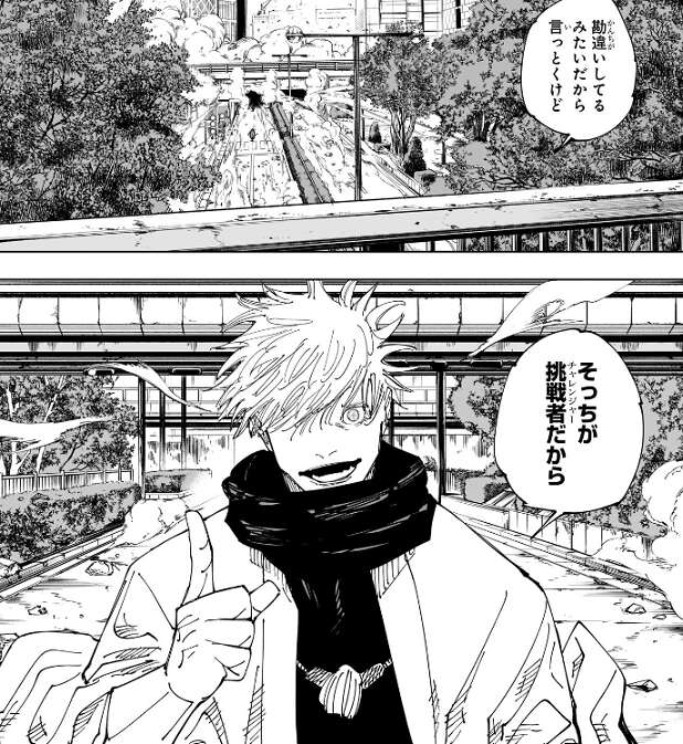 勘違いしてるみたいだから言っとくけど、そっちがチャレンジャーだから、と五条は言い放ちます。五条のセリフを聞き、クソガキが、と宿儺は吐き捨てます。