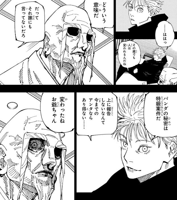 場面は少し前に戻ったようで、楽巌寺は夜蛾を殺したことを五条に告白します。しかし、五条はその事で楽巌寺を責める事はせず、夜蛾が最後に何か言ってたか、五条は楽巌寺に質問します。パンダが突然変異ではなく作り方がある事を夜蛾が言っていた、と楽巌寺が話すと、その歳でも人は変われるんだね、と五条は言います。どういう意味だ、と楽巌寺が聞くと、五条は楽巌寺がパンダの件を誰にも言っていないことに気付いていて、パンダの秘密は特級案件だ、上に報告しないなんて今までのアンタならあり得ない……、変わったね お爺ちゃん、と五条は楽巌寺に言います。