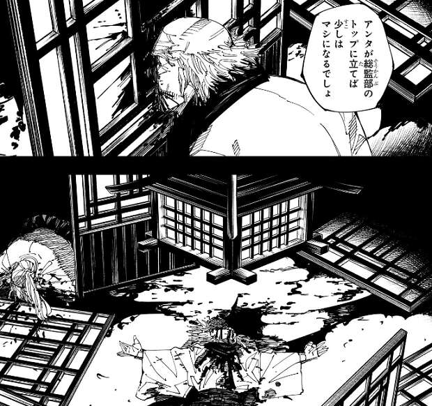 五条は、アンタが総監部のトップに立てば少しはマシになるでしょ、と言いますが、総監部のトップは既に全員殺されているようで、その様子がうつります。誰に殺されたかは不明ですが、羂索辺りでしょうか?五条や楽巌寺が生き残っていれば、総監部トップは楽巌寺になりそうです。