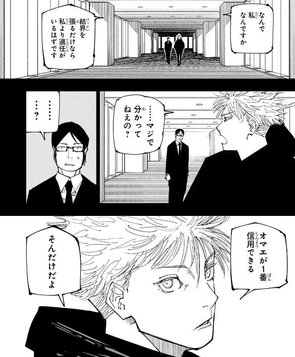 場面は五条と伊地知が通路を歩いている所に変わり、伊地知が結界を張る役目を何故自分に指名したのかを聞いています。結界を張るだけなら他に適任がいると伊地知は考えますが、五条は伊地知が一番信用できると考えていて、その事を伝えます。