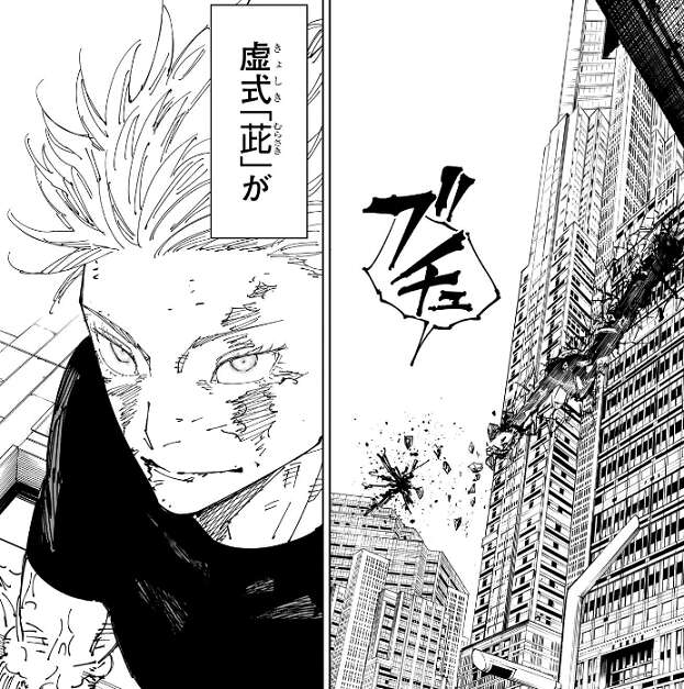 魔虚羅が宿儺のように斬撃を飛ばしたことに、高専メンバーは驚き、家入は治癒力が落ちている五条を心配します。すぐに右腕を治せない五条に、魔虚羅と顎吐が襲い掛かります。