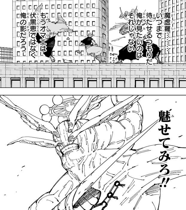さらに魔虚羅に、もうオマエは伏黒恵ではなく俺の影だろう、と語りかけ、魅せてみろ!!と宿儺は魔虚羅に言います。そう宿儺が言うと、魔虚羅の法陣がガコンと音を立てて回転します。