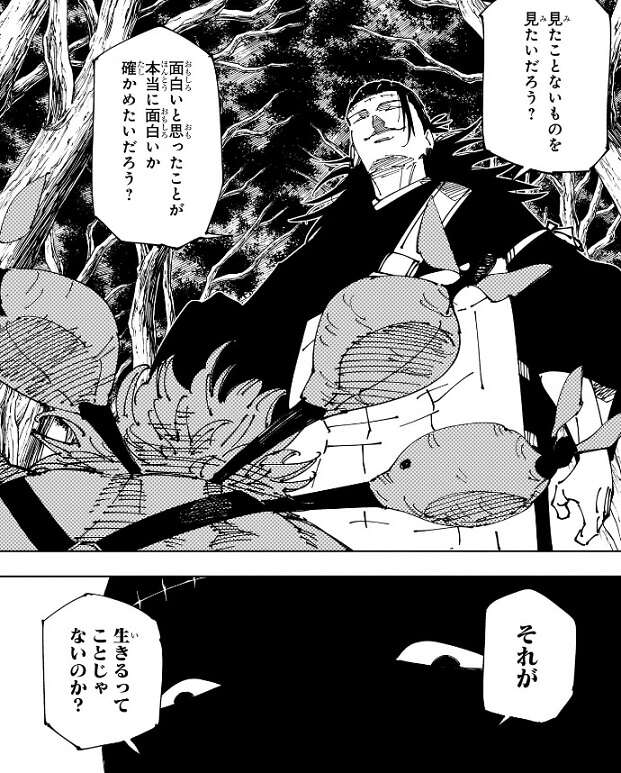 黄櫨は羂索に何がしたいのか、と問うと、羂索は死滅回游を終わらせて日本人と天元との超重複同化を発動する計画を正直に話します。黄櫨は理解できなかったようで、はっ、なんじゃそりゃ、と吐き捨てるようにつぶやきます。そんな黄櫨に、見たことないものを見たいだろう?面白いと思ったことが本当に面白いか確かめたいだろう?それが生きるってことじゃないのか?と、羂索は黄櫨を見下しながら問いかけるように言います。しかし、黄櫨は毎朝テメェのクソでも眺めてろ、と吐き捨ててまともに返事をしません。結局、黄櫨もここで殺されてしまいます。