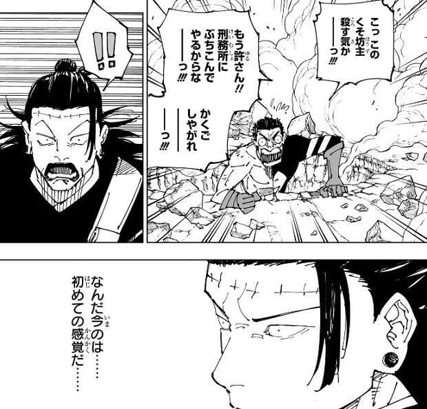 しかし、髙羽の術式「超人(コメディアン)」によって攻撃が効かなかったことにされたようで、ほとんどダメージを受けていません。髙羽は、許さん、刑務所にぶちこんでやるからな、かくごしやがれーっ!!!と、ギャグ漫画のように叫んでいますが、予想外の展開に羂索も驚いています。羂索にとっても術式・超人の術式効果は初めての感覚だったようで、攻撃が効いていないのではなく……、効いていないことになったような……!?と、心の中でつぶやいています。
