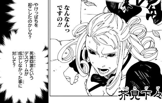 女性プレイヤーは、せっかく羂索によって呪物となり受肉して再び肉体を得たのに、今度は羂索によって殺されようとしている状況を理解出来ないでいました。死滅回游というデスゲームが成立しなかったので、羂索がやけっぱちを起こしたかしら?と、女性プレイヤーは推測していますが、再び生を与えて今度は奪うのはあんまりでなくって!?と、怒りながら羂索から逃げていました。
