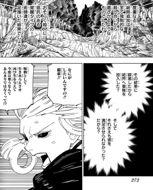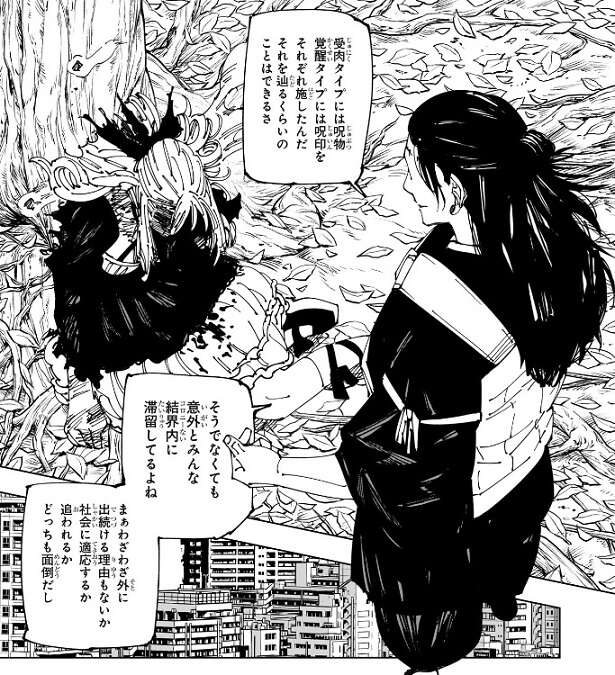 死滅回游を終わらせ天元と日本人との超重複同化を実行する為、プレイヤー狩りを行っている羂索は、名前は分かりませんが女性プレイヤーと黄櫨をあっさり殺してしまいます。