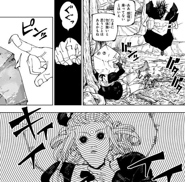 黄櫨は羂索が入念に監視しているという話を聞いて、いつでもトンズラこけるって話か?弱気じゃねぇの、と羂索に言いますが、羂索は弱気な訳でなく、また黄櫨とグタグタ戦うつもりもなく既に多数の呪霊を黄櫨に向かわせていました。一斉に黄櫨に多数の呪霊が襲い掛かりますが、黄櫨は自分の歯を爆弾に変えて呪霊を爆破し、呪霊をかわします。
