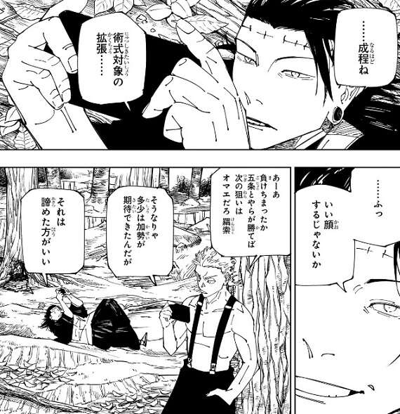 その時、羂索はスマホを出し五条と宿儺の決戦の様子をチェックします。ちょうど、宿儺が空間 世界ごと存在を分断する斬撃で五条を殺した場面だったようで、宿儺が術式対象の拡張で斬撃を強化したことも知っているようです。黄櫨は五条が負けたことを残念がっていて、もし五条が勝っていたら次の標的はオマエだろ、と羂索に言います。
