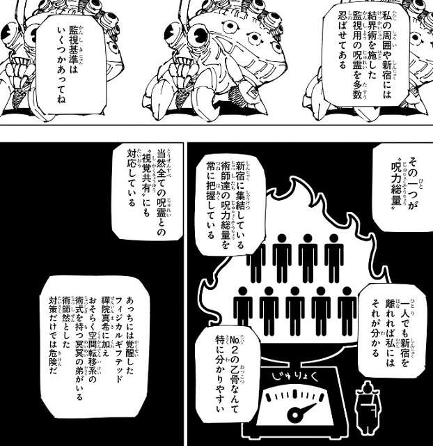 しかし、羂索は自分の周囲や新宿に結界術を施した監視用の呪霊を多数忍ばせて、監視をしていると言い、“呪力総量”などいくつかの基準で監視しているから加勢は諦めた方がいいと黄櫨に言います。新宿に集結している術師達の呪力総量を把握していて、一人でも新宿を離れると羂索にはそれが分かるようになっているようです。特に呪力総量の大きい乙骨などは、すぐに察知されるようです。さらに全ての呪霊と“視覚共有”もしていて、真希のような呪力のない者が移動しても視覚で察知できるようです。また、憂憂が(おそらく)持っている空間転移系の術式を使って空間移動する者がいても、これも察知出来るようにしているようです。
