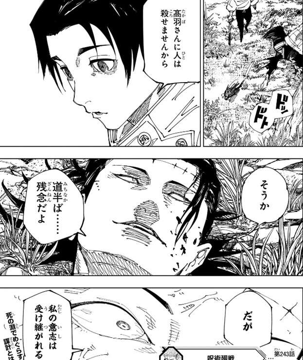 羂索は首を切り落とされてしまいますが、その事など気にもせず、初めからこのつもりだったのかと羂索は乙骨に質問します。すると、髙羽さんに人は殺せませんから、と乙骨は答えます。乙骨は最初から髙羽は人を殺せないと分かっていたようで、隙を見て参戦するつもりだったようです。道半ば……、残念だよ、羂索は言いますが、私の意思は受け継がれる、と不穏な言葉を残します。