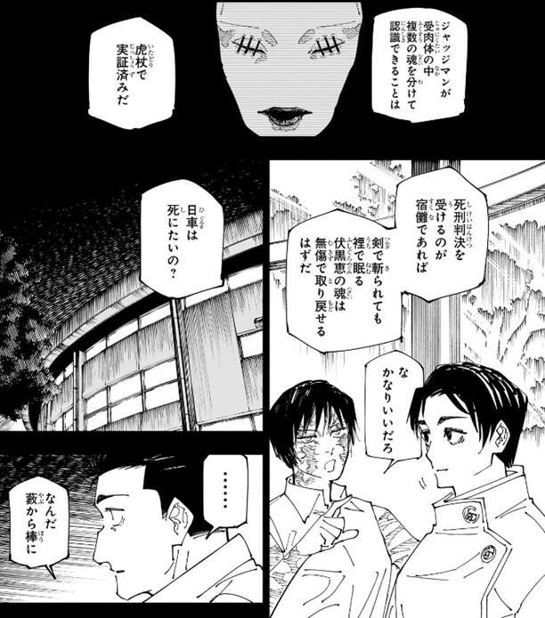 処刑人の剣で斬られた者は例外なく死に至りますが、対象はあくまで死刑判決を受けたものに限定され、さらにジャッジマンは受肉体の中の複数の魂を分けて認識することが出来ます。これは虎杖と宿儺で実証済みでした。死刑判決を受けたのが宿儺なら、剣で斬られても裡(うち)で眠る伏黒恵の魂は無傷で取り戻せるはず、と日車は言い、真希も、な、かなりいいだろ、と同意しています。その後、虎杖と日車は場所を移動して二人で話していますが、日車は死にたいの?と、虎杖が日車に質問しています。第245話で同じセリフが日車の脳裏に浮かぶシーンがありましたが、あのセリフは虎杖が日車に質問したセリフでした。日車は反転術式を使えないのに、当たり前のように宿儺と戦うので、死にたがっているように虎杖には見えたようです。