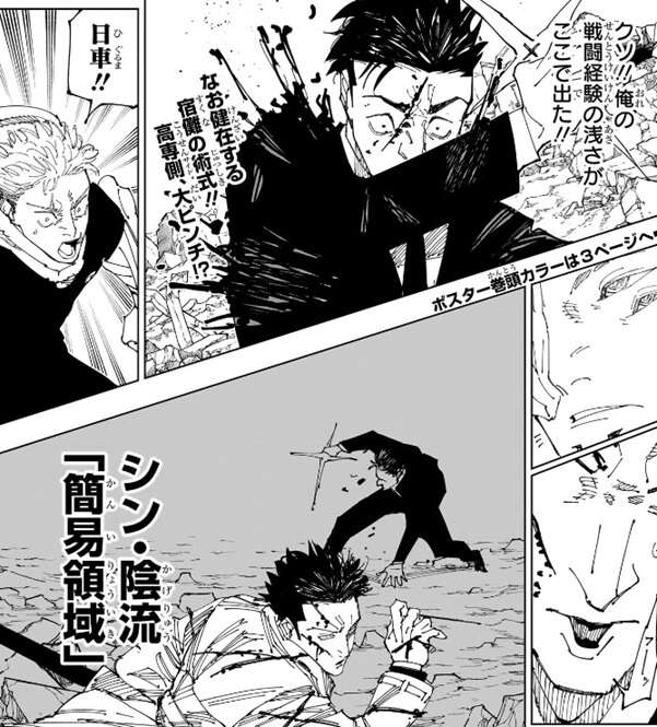 場面は新宿決戦へと戻り、日車は宿儺の術を受けていましたが、領域展延で中和していたことが判明します。日車が術師として覚醒したのは二か月弱前で、それを考えると領域展延を使えるのは異常な成長速度と言えます。