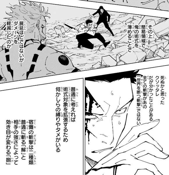 日下部は宿儺の術式を分析し、全ての斬撃が「世界を断つ斬撃」になるわけではないと推測します。宿儺の斬撃は普通に斬る「解」、相手の強さによって効き目が変わる「捌」、「解」の術式対象を拡張・強化した「世界を断つ斬撃」だと分析します。さらに日下部は「捌」、ゼロ距離での「解」、「世界を断つ斬撃」は、呪力強化をしようが、領域展延、簡易領域を使おうが、どの手段でも防御不能で基本即死になると推測します。さらに、日下部は宿儺が渋谷で使った「炎」の術式を使わないことを疑問に思います。しかし、考えるだけ無駄、この状況では炎の術式を使われても対応出来ないと日下部は考え、宿儺は炎の術式を今は使えないと決めつけて、割り切って対応する事にします。