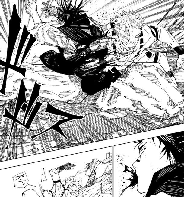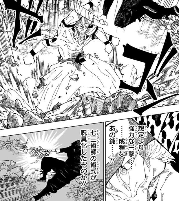 続いて、猪野が七海が使っていたのと同じような大鉈を持って宿儺を攻撃します。この大鉈は七海の術式・十劃呪法が呪具化したもののようで、猪野が宿儺を7:3の比率の点を攻撃した事で、宿儺にとっても想定より強力な一撃が入ります。しかし、宿儺は大鉈ごと猪野を攻撃、宿儺の攻撃は猪野には重すぎたようでそれ以上猪野は攻撃できません。
